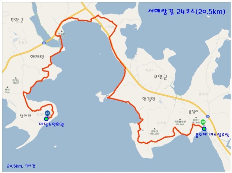 - - 시점: 무안군 현경면 용정리 봉오제 버스정류장교통편) 무안버스터미널에서 211-5 농어촌버스 승차 '봉오제'정류장 하차- 종점: 무안군 해제면 창매리 매당노인회관- 코스 내 그늘이 많지 않으므로 사전에 준비가 필요함- 일반도로로 도보이동이 불가하여 차량으로 이동해야 하는 구간이 있음(마산활어집앞~가입리/210-1, 210-2, 210-3 버스 이용)
